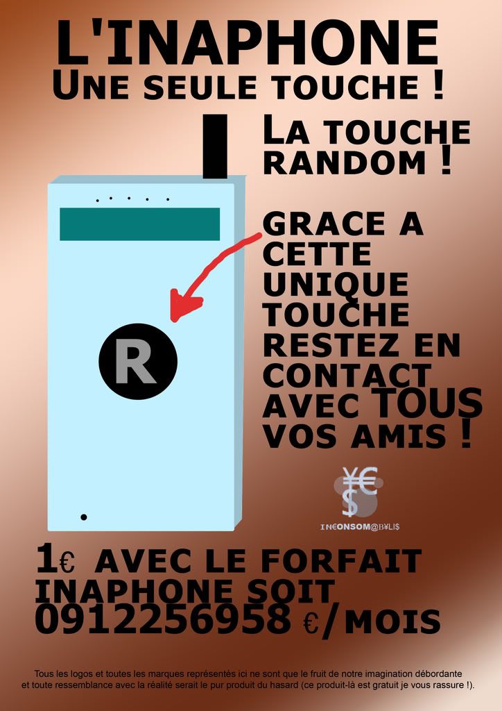 L'INAPHONE est un téléphone next-gen à la pointe de la technologie ! Pour pouvoir l'utiliser, il vous faut déjà un ordinateur, muni de INATUNES. Graçe à cela vous allez pouvoir entrer tout vos contacts téléphoniques avant de les transférer sur votre INAPHONE. Ceci fait, vous pouvez enfin téléphoner ! mais comment ? Et bien il suffit d'appuyer sur la touche "R", initiale de Random. Vous connaissez le Random, ou Shuffle, ou Aléatoire, fonction permettant sur les lecteurs mp3 de mélanger les titres pour tomber au hasard sur l'un d'entre eux ? Quand vous appuyez sur la touche "R" de ce téléphone, c'est précisément la même chose qu'il se produit. Un de vos contacts téléphoniques est appellé totalement au hasard ! Ce principe révolutionnaire permet de rester en contact avec tous vos amis !